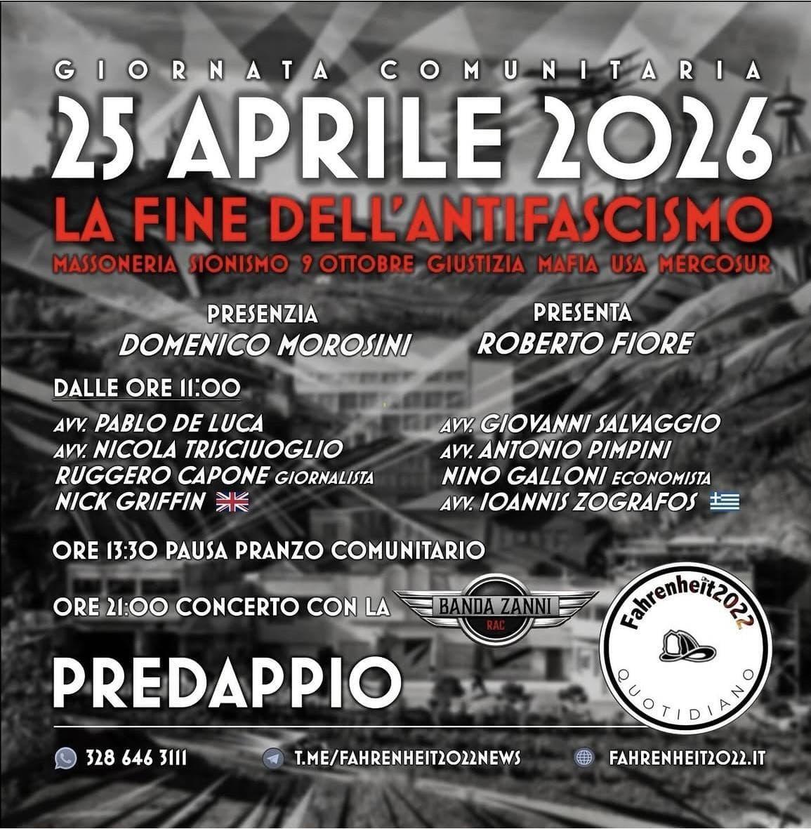 Oltre al dibattito, che verte su una serie di argomenti sconnessi tra loro, tra cui l’immancabile massoneria e il richiamo alla condanna di primo grado che Fiore ha avuto per l’attacco del 9 ottobre 2021 alla sede romana della Cgil, e che tra le altre cose punta a chiedere l’abrogazione delle leggi Scelba e Mancino che colpiscono le manifestazioni fasciste (a dire il vero quasi mai applicate), la locandina dell’iniziativa fascista prevede anche un “pranzo comunitario” e, la sera, il concerto della Banda Zanni, vecchio gruppo Rac (Rock against communism, ovvero i gruppi musicali dell’area neofascista).